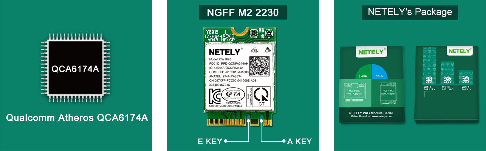 NETELY’s DW1820 is a NGFF M2 WiFi bluetooth adapter. It is based on Qualcomm Atheros QCA6174A network chipset. It is designed for laptop computers for internet surfing and bluetooth streaming. It will provide 2X2 wave wireless ac network connection, allow computers get 300Mbps on 2.4GHz and 5GHz 867Mbps for video source streaming, gaming, and office use. The bluetooth 4.2 is mainly used on wireless bluetooth device such as wireless headset, mouse, sound bars, keyboards. Build in advanced low power consumption technology to extend laptop battery working time.